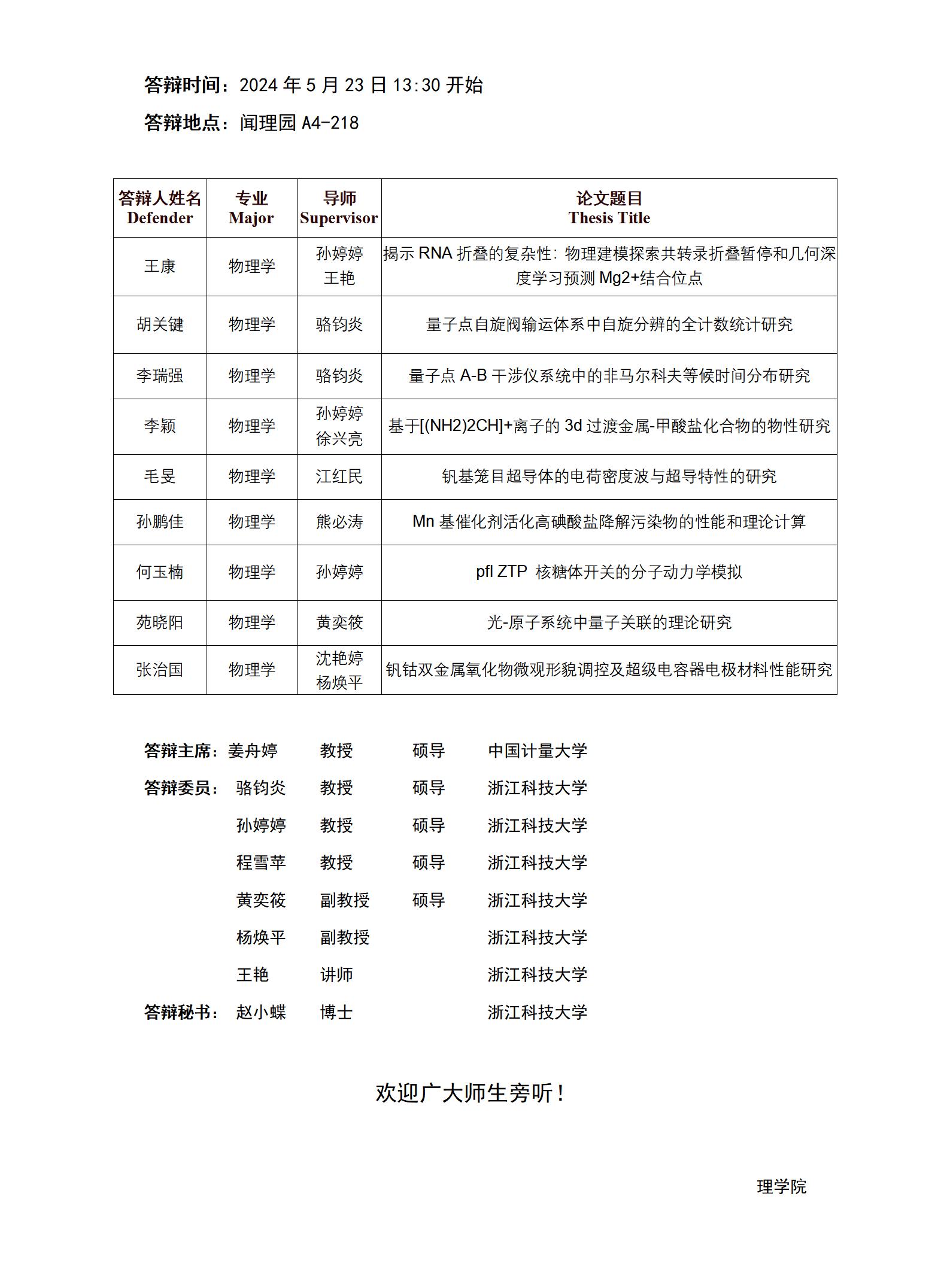 2024年浙江科技大学硕士研究生学位论文答辩公告(物理学1组)