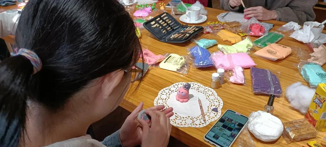 之后陆文婷介绍了粘土的来源,分享了粘土的减压功效,大家观看了介绍的视频,体会到了艺术背后情感、精神的寄托。艺术专业的同学作为“外援”也为大家讲解了粘土捏制的工艺,为大家快乐地“捏捏捏”保驾护航。