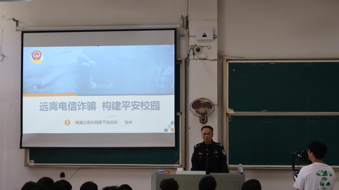 2024年4月18日14:30,为持续强化学生安全教育工作,引导学生树立正确的安全观,共同维护和营造学校安全稳定的校园环境,切实增强学生的安全意识,防诈骗意识,av影片 特邀请西湖公安分局留下派出所马冲警官为同学们开展了一场“远离电信诈骗,构建平安校园”的专题讲座,av影片 各年级辅导员、各班班委、寝室长、学生代表参与本次讲座。