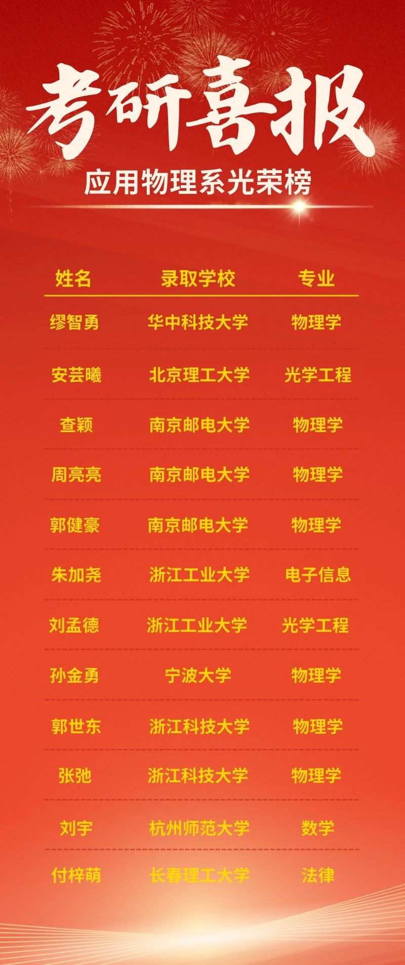 杏坛吐馥结硕果,兰台振翼报佳音。在2025年全国硕士研究生招考中,浙江科技大学应用物理系共计12位学子被华中科技大学、北京理工大学、南京邮电大学、浙江工业大学等高校成功录取。(文稿来源:浙科物理)