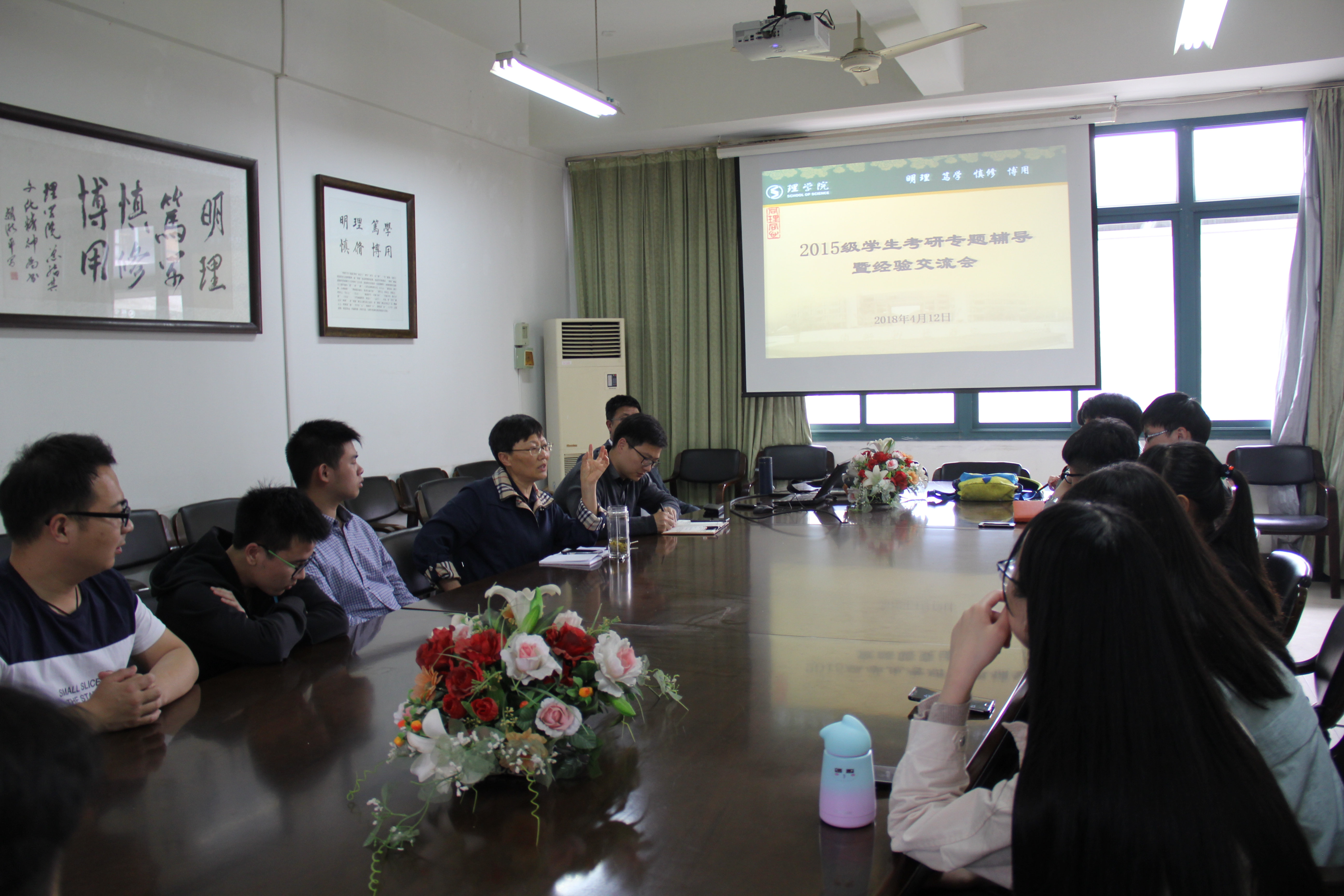 今年考取浙江大学研究生的信计142班王树一同学做交流汇报,2015级考研意向学生听取了报告。本次交流会由学院党委委员王宝明主持。