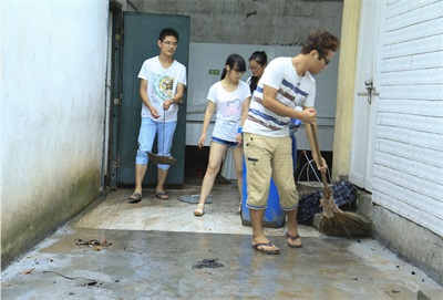 今天是台风的第三天,台风的影响渐渐小去,积水退去,但是积水卷来的泥沙成了校园里的“狗皮膏药”。于是我们将学校打扫了一番,大致恢复了之前的样子。傍晚时分,水电也陆续恢复了供应,我们顺利地克服了困难,战胜了风雨。