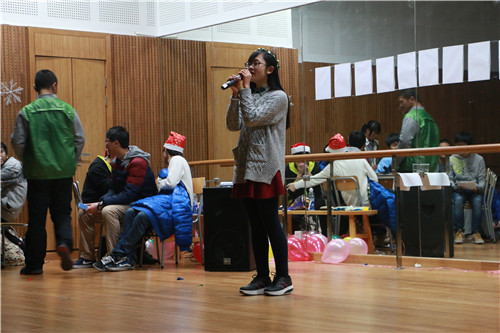 清脆、甜美的歌声,拉开晚会的序幕。圣诞节日的气氛,在同学们间迅速漫开,经过简单的分组,同学们迅速进入到第一个游戏“抢椅子”,围着椅子,同学们展开了激烈的角逐。如果说抢椅子同学们灵活的身姿的体现,那么“五毛一块”则是智慧的比拼。每组分别派出一位男、女同学,男女同学用智慧展开对决,比赛关键时刻,出现“二女争一男”,真是险象环生、惊心动魄。