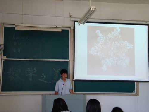 首先进行演讲的是陆颜,她即兴发挥,结合影视作品和数学之间的关系做了一番精彩的解释,以《美丽心灵》和《暗算》这类优秀的作品为切入点,讲解了伟大的纳什和博弈论,也讲解了密码学应用等看似高深实则有趣的故事。在短短的5分钟内,陆颜完成了演说过程,充分活跃了气氛,调动了大家的参与积极性。随后由陈科磊结合幻灯片进行演示,其主要内容是模式,分形,混沌和拓扑,他借助于25幅精美的图片向大家逐一介绍了这些事务在实际生活以及自然界的存在形式,并在讲解过程中让大家参与讨论,气氛融洽。最后由张义结合幻灯片来讲解数学的实际应用,他举例说明了余弦定理在新闻分类中的应用,数学模型在地心说中的作用,最后结合应用大背景对这些做了简要的总结。