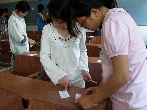 此次活动我们特意采用“逛‘花灯’”的形式,同学们分组结队随意观谜作答。一些耐人寻味的谜题更是惹来不少同学群起而攻之。“除夕即是岁末——多”、“上海滩——登陆”等难题都被一一分析出来。同学们神情贯注、欣喜若狂,我们的欢声笑语在教室里遍地开花。