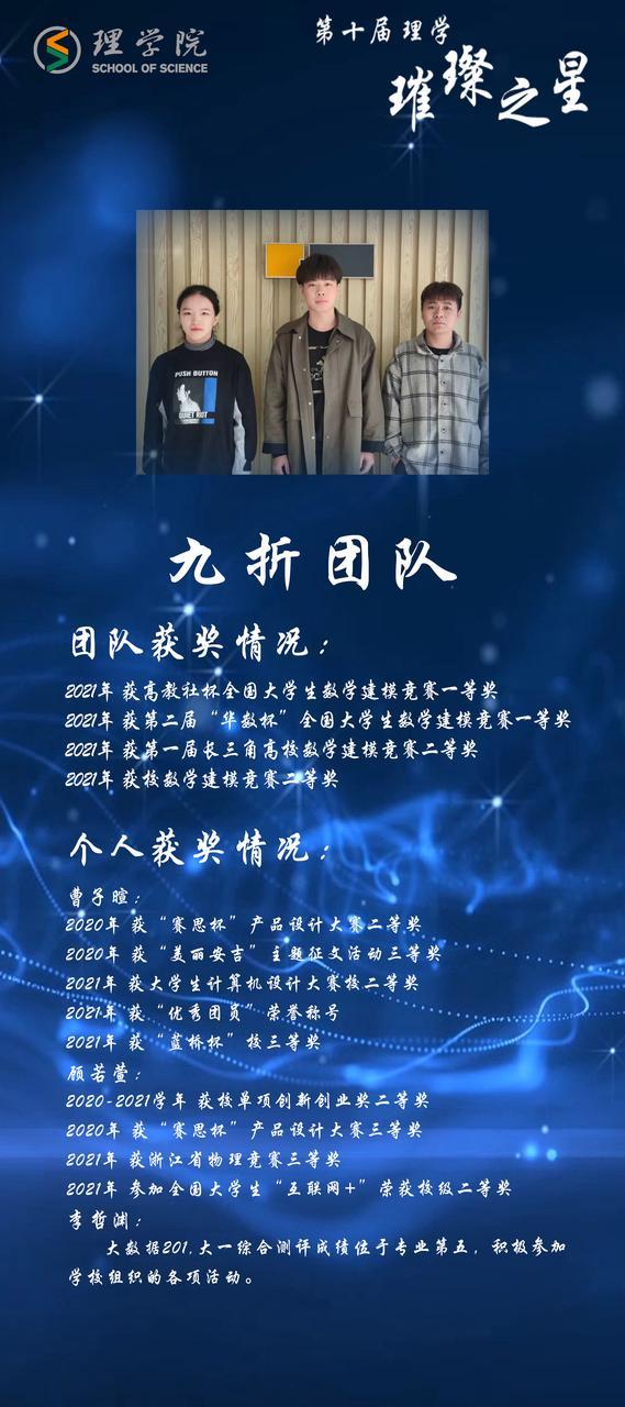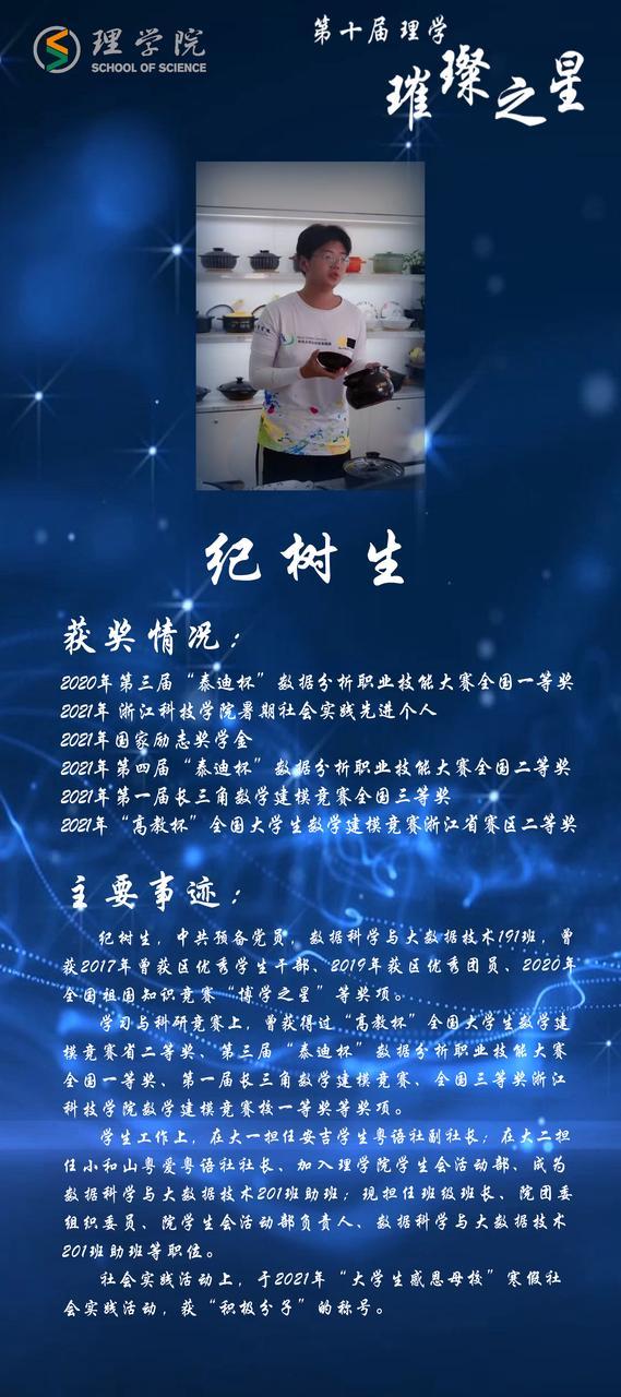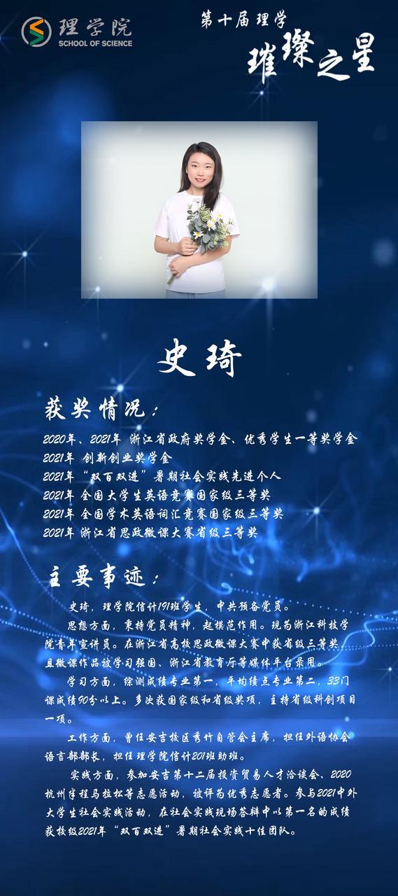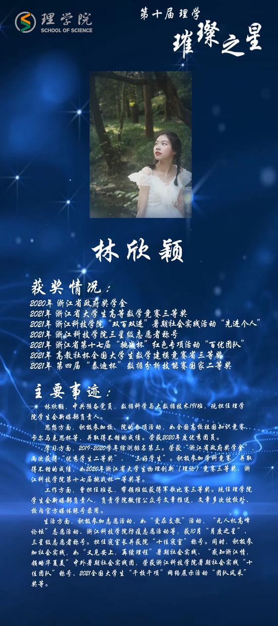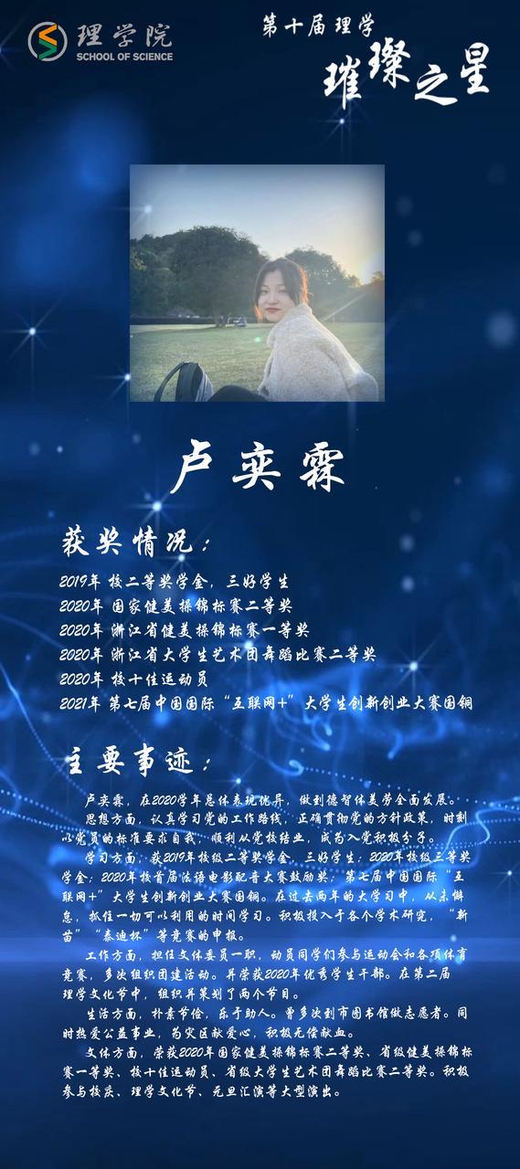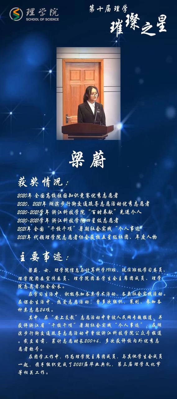 灿若繁星,汇聚理学星光;和山之畔,照亮浙理梦想。璀璨之星,自强不息,他们如夜空的明星,为我们指引前方的道路;理学学子,厚德载物,用更好的自己推动着学院前进。