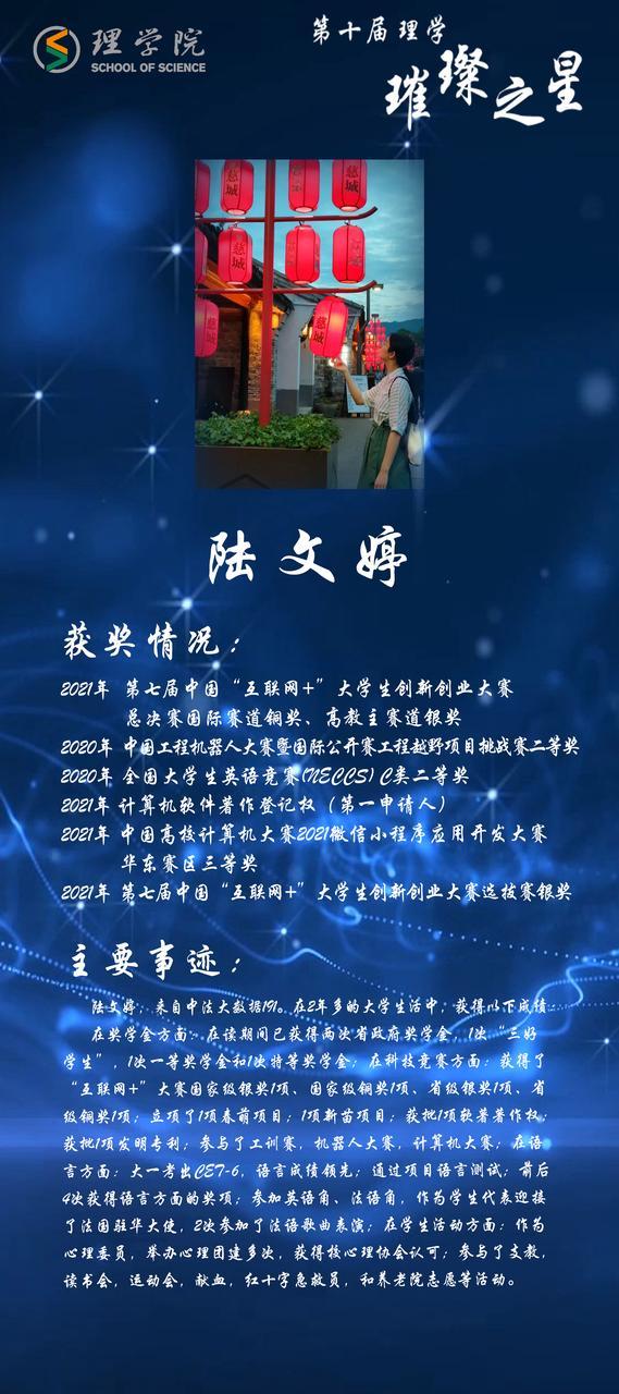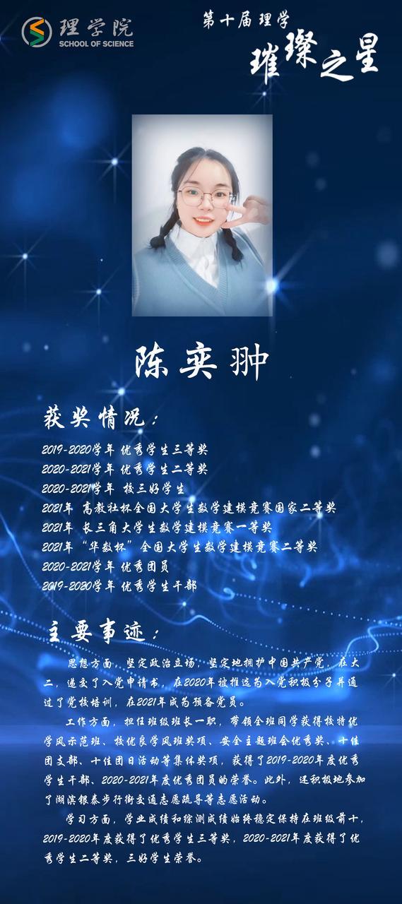 的宣传工作。数据科学与大数据技术(中法班)192班卢奕霖热爱舞蹈,获多项舞蹈奖项;勤奋学习,获奖学金,多种竞赛奖项等。数据科学与大数据技术191班纪树生担任班长、院团委组织委员、院学生会活动部负责人等多种职责,分享了他在学科竞赛道路上的成长之旅。应用物理191班研究生吴白瑞,发表多篇论文、拥有多项专利,他分享了他的科研道路。数据科学与大数据技术201班九折团队,拥有着“纸折九次,并非不可”勇于突破的探索精神,分享了他们获全国大学生数模竞赛一等奖的经验。数据科学与大数据技术192班汪安琪,凭借着自我管理和毅力,参与了多项体育赛事并获奖,特别是中国大学生皮划艇锦标赛冠军。