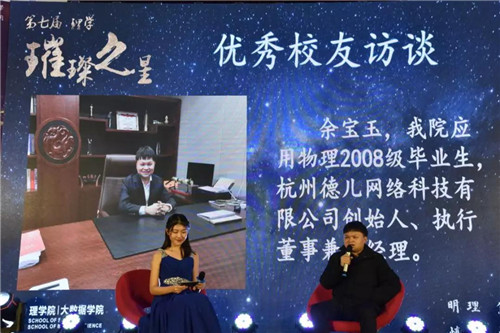 av影片 应用物理2008级校友,杭州德儿网络科技有限公司创始人、执行董事兼总经理余宝玉获杰出校友璀璨之星。他在访谈中回顾了自己的大学生活,叙述了个人创业经历,并建议大家要在大学期间广交朋友、学好专业知识。