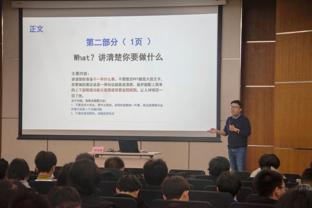 蔡老师在介绍和分析了我校往届学生参赛获奖情况后指出,写好一份创新创业计划书,首先要充分了解市场现状和行业背景,其次在创业计划书中要讲清楚自己项目的研究方向和创新内容,并要从“发现痛点、用户研究、竞品分析、商业模式、产品研发、项目团队、财务预测与融资计划”等方面作详细介绍。