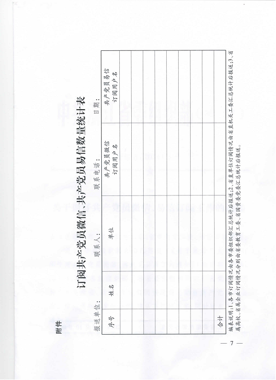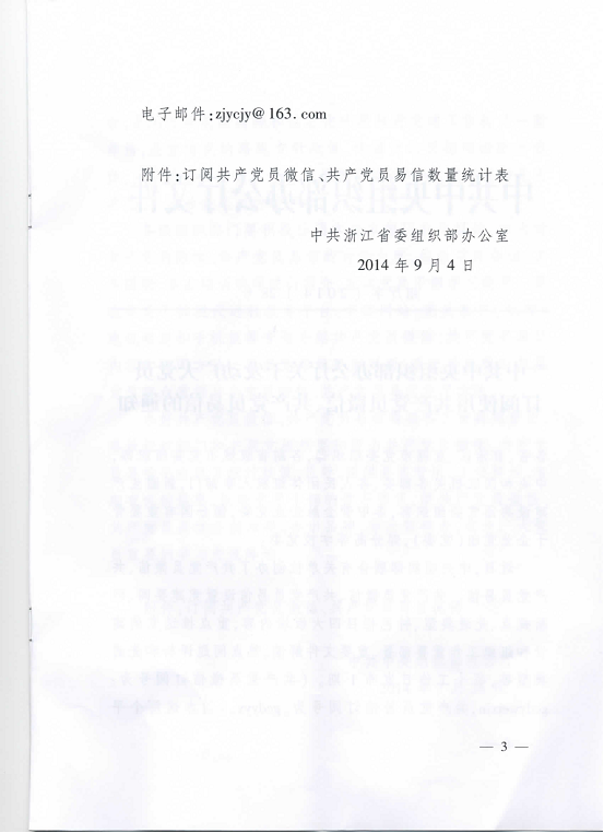 现将省委组织部《关于做好共产党员微信、易信订阅工作的通知》(浙组办﹝2014﹞5号)转发给你们,请按通知要求,发动广大师生党员根据使用习惯订阅共产党员微信或易信,并于每月23日前,将《订阅共产党员微信、共产党员易信数量统计表》报组织部(2014年10月份开始,只需报送每月新增党员订阅情况统计)。Email:[email protected]。联系电话:85070107。