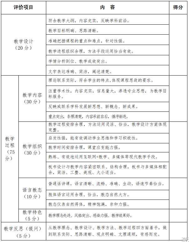 4、主要考查教师的基本教学技能,包括教学设计、课堂教学和教学反思能力;强化“互联网+”教学运用,探索现代信息技术与教学过程的深度融合;注重课堂师生互动,增强课堂活力,积极探索案例式、讨论式、研究式、情景式、翻转课堂等行之有效的教学模式和方法,强调过程化考核。