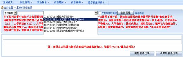 2)如果弹出“该课程不再开设,请选择该课程的替换课程进行重修”的提示信息,则在下拉列表框中选择该课程的替换课程。课程替换对照信息,可到本学院公告栏查询或向本学院咨询;