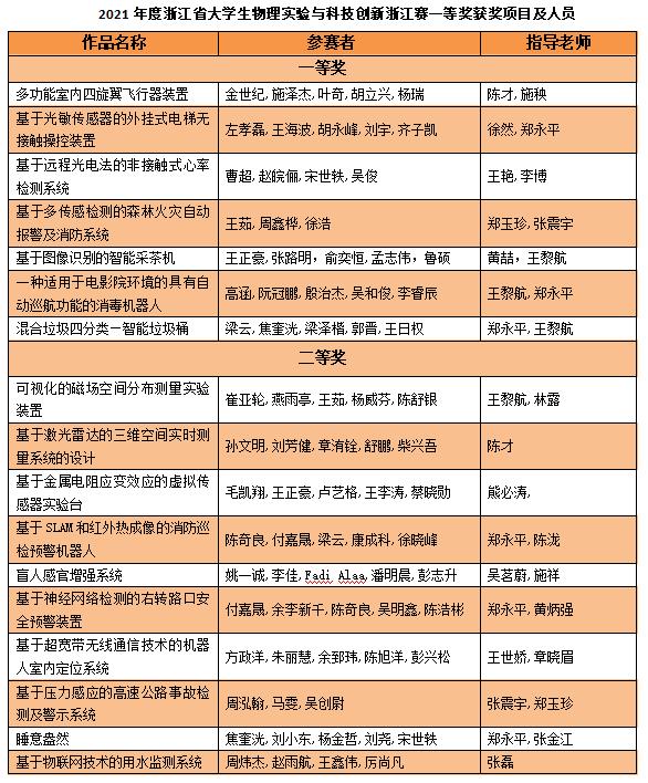 10月30日,浙江省第十二届大学生物理实验与科技创新竞赛决赛杭州举行。经过激烈答辩角逐,本次大赛我校共有34件参赛作品获奖,其中省级一等奖7项、二等奖15项、三等奖12项,优秀指导教师7人,我校并获得优秀组织奖,获奖数位列全省第二,一等奖数全省第二,一直保持着我校自参加该赛以来的高水平成绩。