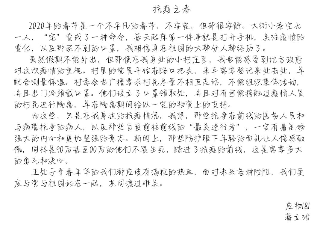3月10日下午,应用物理学181团支部开展了线上团日活动视频会议。会议中,团支书介绍了实时疫情和防疫措施,同时对“停课不停学”的线上教学模式展开讨论,同学们积极反馈,并相互督促做好时间管理,抓好课业学习。应物181团支部进行的抗疫作品征集活动,以文章等形式表达了对抗疫工作者的敬佩和感谢,用文字书写同学们众志成城、齐心协力抗击疫情的信心和决心。