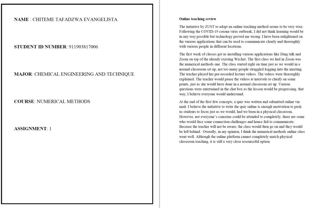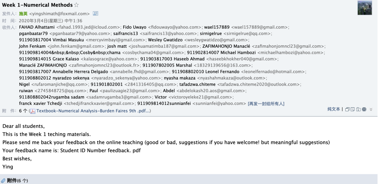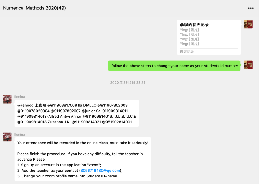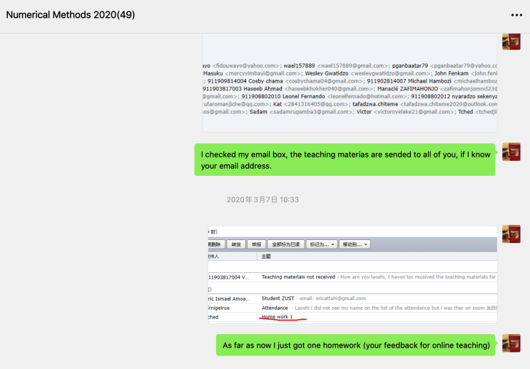 留学生教务(如潘贺、朱凡老师等)的热心及时的帮助下,忐忑的心有所放下。因为于2月19日开始,利用10天左右的时间通过微信群成功地联系到了班上的46名学生,同时将37名学生顺利迁移到了ZOOM教学平台,对于没有联系到的2位学生和没有迁移到ZOOM平台的学生,在留管中心老师的帮助下,搞清楚了原因(已办理退学5名,4名回国网络差无法用ZOOM)。于2月24日开始直至3月3日(第一次课的前一天),通过微信群,指导学生如何利用ZOOM进行在线上课、反复告知学生上课的时间等。以争取最大限度地线上教学硬件资源的充分准备。