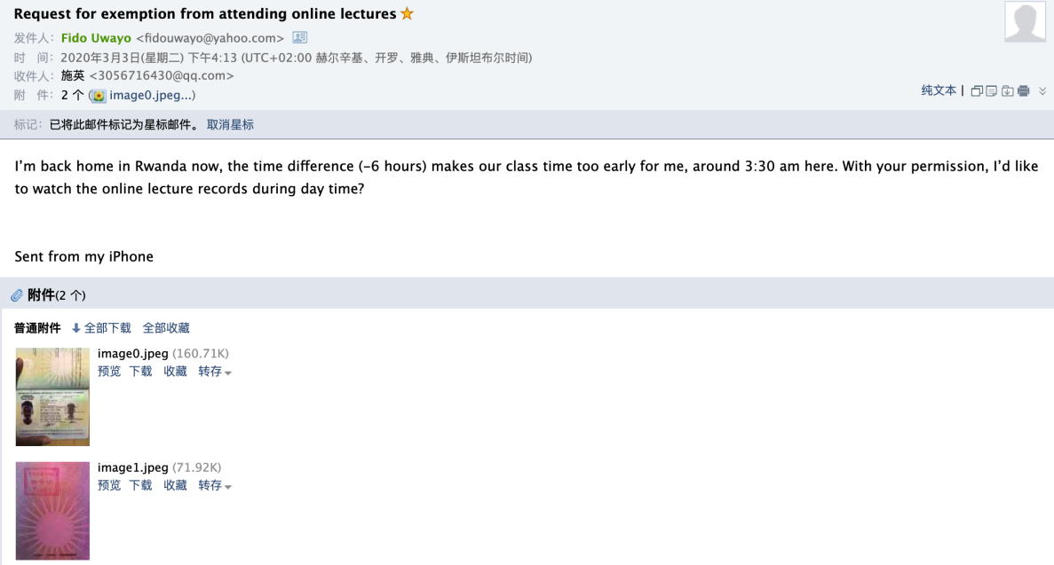 非洲、东欧国家的学生,比北京时间晚几个小时,比如本课程是建议学生北京时间9:30开始进入ZOOM教室,9:50正式上课,但是对于有些国家的学生是凌晨(比如,课上学生学号911907802004姓名ATTAHI ERIC ISMAEL AMOAKON 专业INTELLIGENT MANUFACTURING CONTROL ENGINEERING 所在城市科特迪瓦,阿比让市,上课是当地时间凌晨1:30)。教师需站在学生角度,通过录播的视频,课件资料等鼓励学生在无法进行线上授课的情况下进行线下自学,多与教师积极沟通。因时差问题,学生本人通过提高其出入境证明已经向教师申请不进行线上授课,通过教师给其发送教学资料(包括课件、录播的视频、ZOOM自带的视频会议录播视频等、作业答案、随堂测试答案等)。