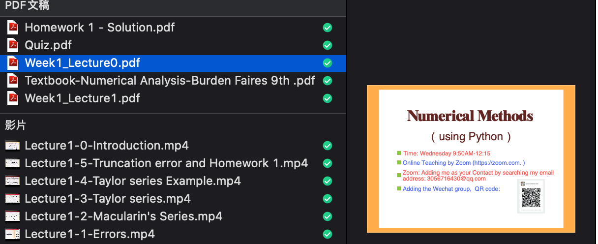 通过上课实践发现,对于不在中国的学生,无法使用百度网盘下载资料,故改为用Email进行教学资料的发送,学生作业、随堂测试的上交和返还。共享的教学资料,包括:电子化教材,课件讲义和PPT,教师录制的知识点教学短视频,作业和测验习题答案,电子化教学直播过程中的公式推导笔记等。