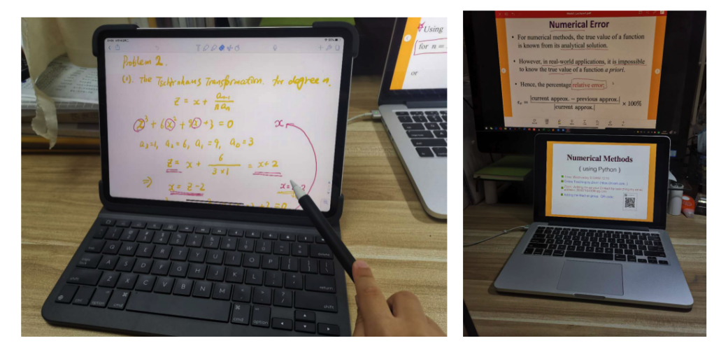 线下教学过程线上化(电子化)。利用软件AirServer将iPad Pro投屏到笔记本电脑,利用Apple Pencil、软件Screen Flow,以知识点形式录制线上教学的录播视频。录播视频的制作目的有:为因网络等原因不能进行线上授课的学生服务;为线上授课过程中跟不上进度的学生服务,学生可以课下反复观看视频进行学习。录制的视频尽可能做到清而小。所谓清,在用Apple Pencil进行公式推导过程中一笔一划要清楚,数学符号便于学生分辨;所谓小,录制的视频要便于利用Email传送给学生。