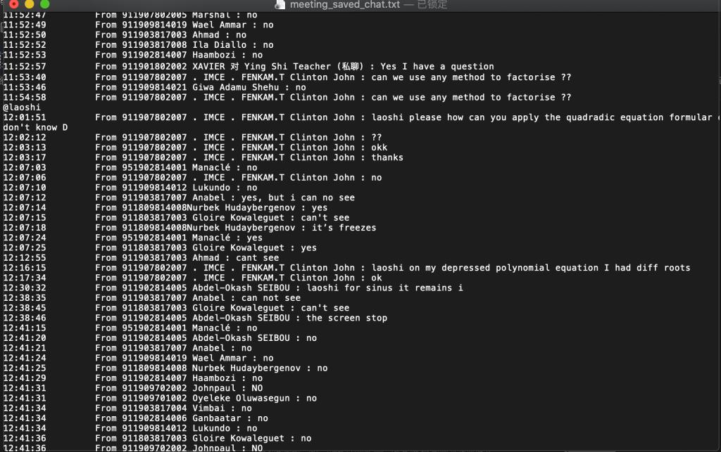 线上教学,所谓知己知彼,就是教师利用自己的另一个ZOOM账号加入在线ZOOM教室,以便实时监测在线教学过程中语音、屏幕共享等是否流畅无暇。线上教学,在知识点的讲解之后,必然要紧随知识点的测试,测试的方式有三种:一在线点名某位学生进行回答,进行屏幕共享;二给学生10-15分钟时间进行解答,然后通过Email在教师规定的时间内上交;三对于简单的问题,要求学生在聊天窗口中进行解答“Yes or No”。以此来实现最大限度的实时互动。下图是ZOOM在上课期间自动保存的聊天窗口的对话内容。教师在直播过程中,可以提问学生,学生的回答可以是简单的Yes或者No。另外,教师直播过程中,将全体学生静音处理了,学生可以利用ZOOM的聊天窗口向老师提问。同时,教师要求学生提问设置为“对所有人”,所以其他学生也可以看到这位学生的问题。这样教师在直播中可以适当放慢节奏,对学生不理解的地方进行进一步详细解释。注:下图是第一次课,考虑到学生适应课堂需要时间,故上课之初教师和学生协商将此次课程延长30分钟,以此提升教学效果,完成此次教学任务。