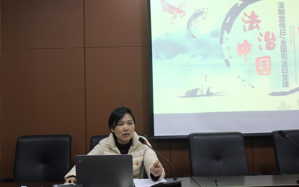 张掬婴介绍了“法制宣传日”和“国家宪法日”确立的背景、宪法的修订情况,重点学习了习近平法治思想以及习近平总书记在中央全面依法治国工作会议精神。她指出,“法制宣传日”和“国家宪法日”不仅是增加一个纪念日,而应该是让这一天成为全民的宪法“教育日、普及日、深化日”。