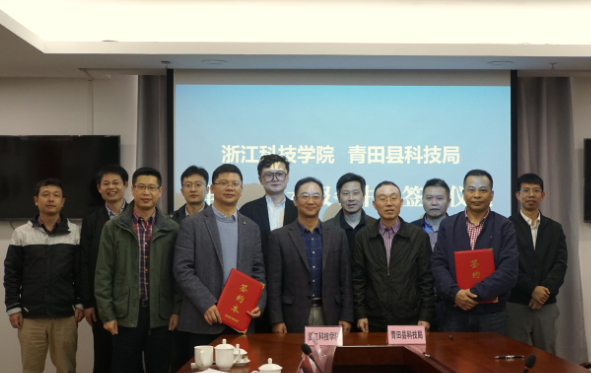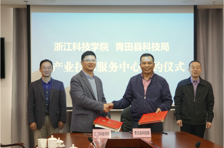 与青田县共建“青田县鞋产业技术服务中心”签约仪式在青田县科技局举行,副校长冯军、青田县科技局局长章旭阳、校科技处处长马伟峰、av影片