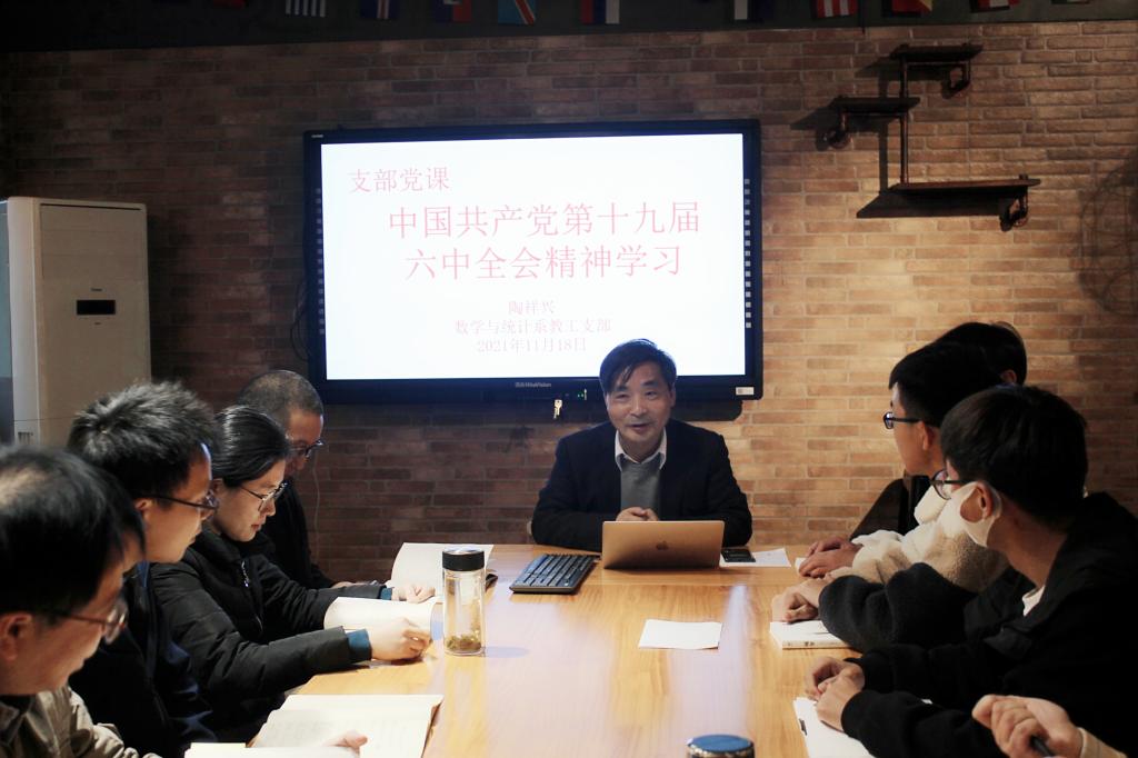 11月18日下午,校党委委员/院长陶祥兴在A4-218会议室为数学与统计系教工支部讲授“十九届六中全会精神”专题党课,数学与统计系教工支部全体党员参加。