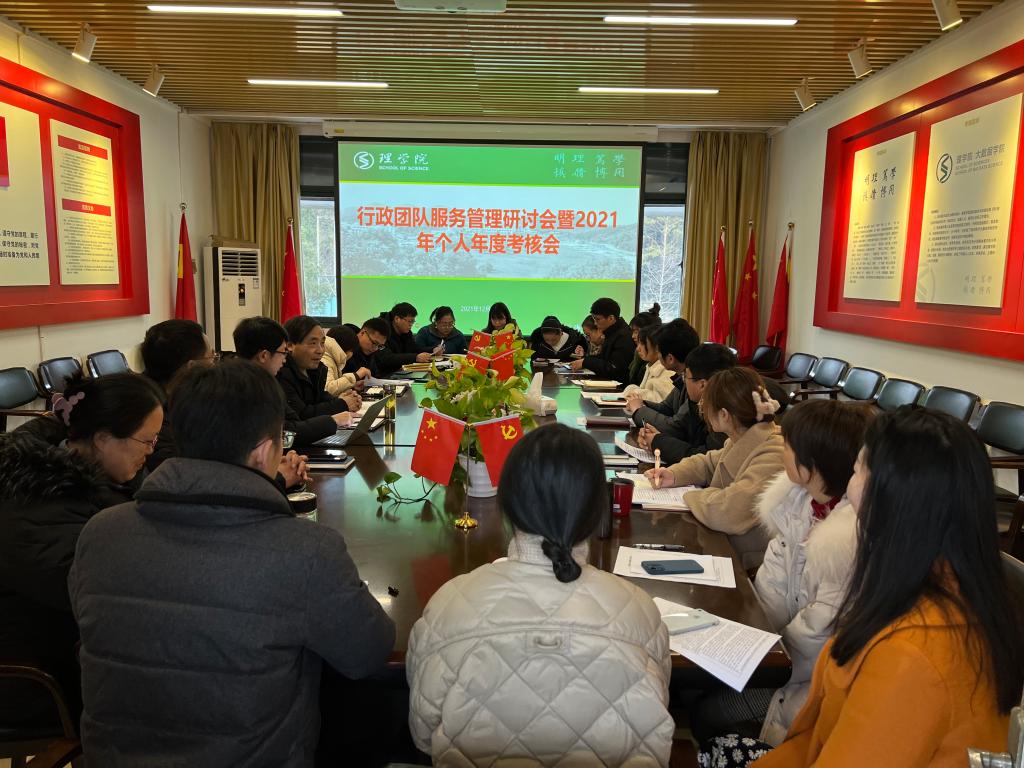 在A4-222会议室召开2021年度个人考核推荐会暨行政团队服务管理研讨会,校党委委员、院长陶祥兴,院党委书记张掬婴、副院长钱亚冠、院党委副书记黄奕筱、院长助理、工会主席章迪平以及全体行政人员参加本次会议,会议由办公室主任王铁军主持。