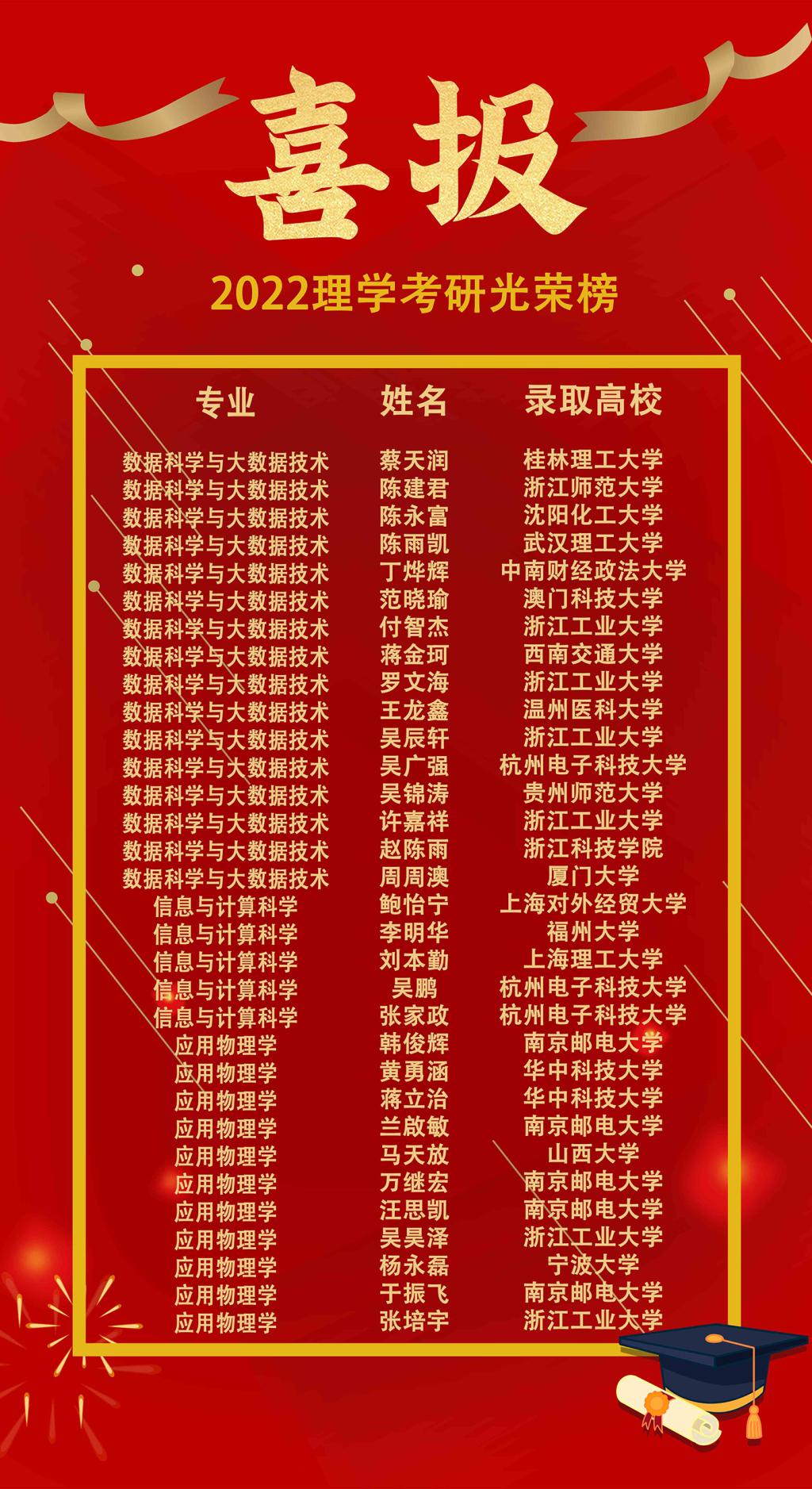 他们在考研战场上取得的傲人成绩让所有人心潮澎湃,他们在自己的舞台上展现出夺目的光彩。在此,真诚祝愿考研成功的同学们在专业领域学有所成,前程似锦。也希望有志读研的同学们能以他们为榜样,以梦为马,不负韶华,砥砺前行,未来可期。(学工办)