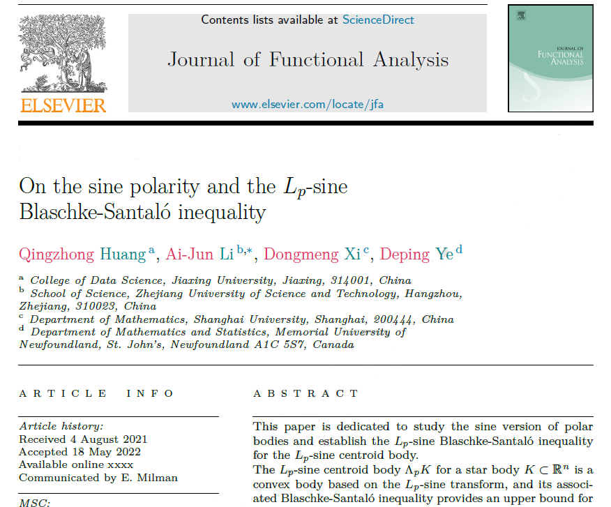 数学与统计系李爱军教授(通讯作者)与嘉兴学院黄卿中博士、上海大学席东盟博士、加拿大纽芬兰纪念大学叶德平教授合作在国际权威数学期刊《Journal of Functional Analysis》上在线发表了题为“On the sine polarity and the Lp-sine Blaschke-Santaló inequality”的学术论文。