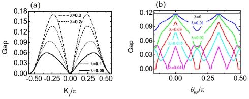 最近研究团队还注意到在钒基笼目超导体中存在有2*2的周期调制结构,并且同时还破坏时间反演对称性,轨道流序的电荷密度波对上述现象给出了比较好的解释。基于这些实验现象,研究团队通过理论计算和分析表明轨道流序对超导体的正常态和超导特性都有较大的影响。在正常态,轨道流序将导致各向异性的电荷密度波能隙[图3(a)]。而在超导态,轨道流序的将会使得原本各向同性的s波超导能隙在费米面上出现了调制,并且随着调制深度的加强将会导致有节点的超导能隙[图3(b)]。这些理论结果不但与新近的实验结果高度一致,并且有望调和不同实验现象之间分歧。相关研究成果以“Impact of the orbital current order on the superconducting properties of the kagome superconductors”为题发表在国际著名学术期刊Physical Review B上 [Phys. Rev. B 107, 064506 (2023)]。