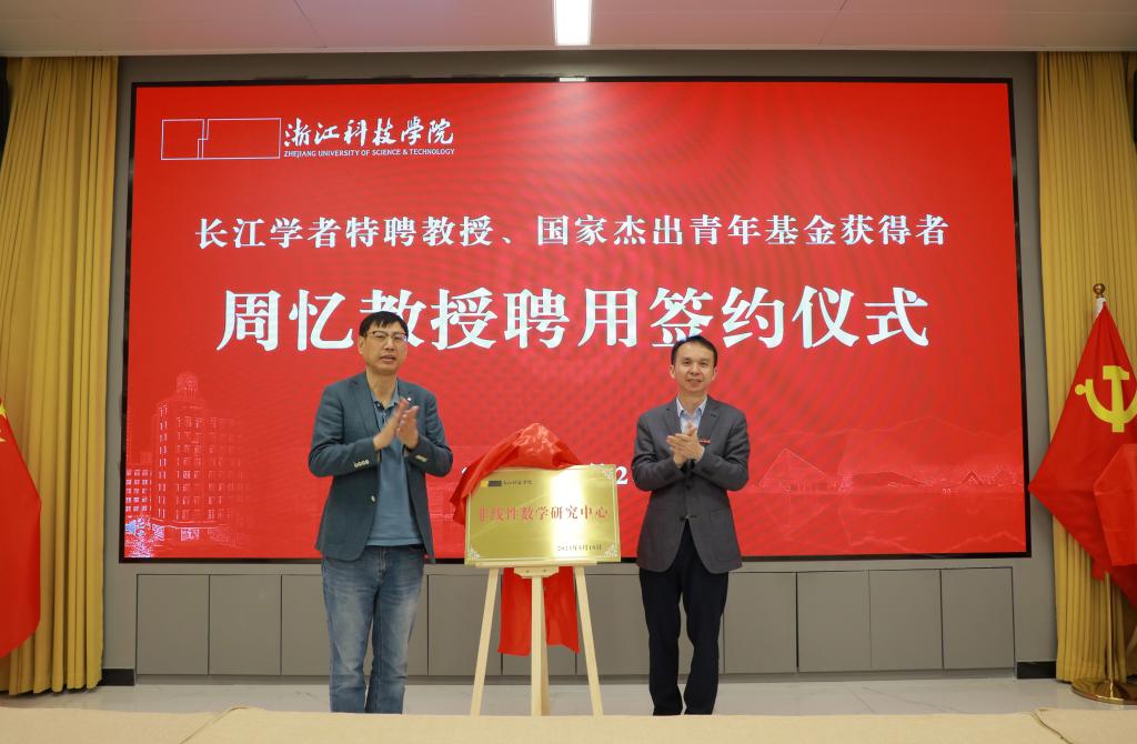 校党委副书记符宁平在会上宣读了学校关于批准成立“浙江科技学院非线性数学研究中心”并聘请教育部长江学者、国家杰青获得者周忆教授担任中心主任的决定。随后,陈建孟校长和周忆教授共同为“非线性数学研究中心”揭牌。