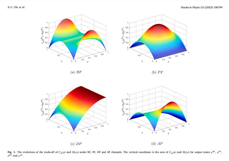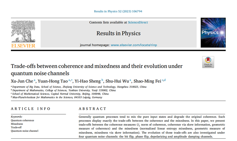 中法大数据2020级本科生车徐骏以第一作者身份在《Results in physics》期刊上发表了题为“Trade-offs between coherence and mixedness and their evolution under quantum noise channels”的科研文章。《Results in physics》是ELSEVIER旗下中科院分区SCI二区期刊。浙江科技学院为第一完成单位,大数据科学系陶元红为论文通讯作者,吴淑慧为共同指导教师。