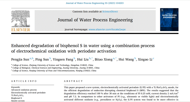 近日,应用物理系量子关联物质研究团队在“电催化新型氧化剂高碘酸盐降解污染物”研究中取得重要进展,研究成果以论文形式发表在国际期刊《Journal of Water Process Engineering》上(IF: 7.0,中科院二区),论文题目为“Enhanced degradation of bisphenol S in water using a combination process of electrochemical oxidation with periodate activation”。物理学专业21级硕士研究生孙鹏佳为该论文的第一作者,熊必涛副教授为该论文的通讯作者,浙江科技学院为第一单位。 本研究由浙江省自然科学基金、国家自然科学基金、嘉兴公益研究项目支持。