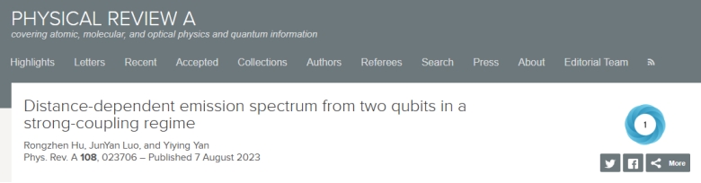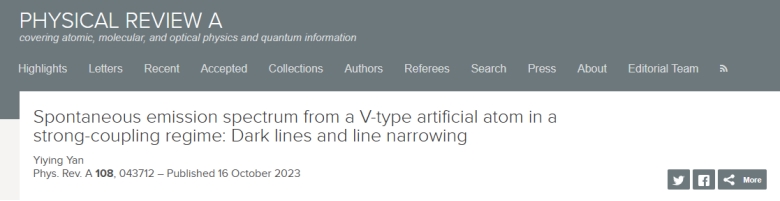 应用物理系量子信息物理研究团队在光与物质强耦合区的自发辐射过程的理论研究方面取得一些进展,相关研究成果以论文形式发表在物理领域国际知名期刊《Physical Review A》(中科院SCI二区,自然指数收录期刊)。其中第一篇论文题为Distance-dependent emission spectrum from two qubits in a strong-coupling regime”,22级研究生胡荣臻为第一作者,骆钧炎老师和颜益营老师共同指导教师和通讯作者。该工作研究了辐射系统的空间距离引起的干涉效应、超辐射及亚辐射现象。第二篇论文题为Spontaneous emission spectrum from a V-type artificial atom in a strong-coupling regime: Dark lines and line narrowing”,该工作研究了三能级体系的光谱暗线与线宽变窄效应,为人造原子体系实验探测这类效应提供理论支撑。这两项工作获得了国家自然科学基金的资助。应用物理系 孙婷婷