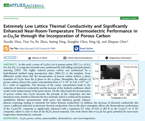 量子关联物质研究团队青年博士赵小蝶在半导体热电材料领域取得重要进展,研究成果发表在《ACS Applied Materials & Interfaces》(IF=9.5,中科院二区TOP),论文题目为“Extremely Low Lattice Thermal Conductivity and Significantly Enhanced Near-Room-Temperature Thermoelectric Performance in α-Cu2Se through the Incorporation of Porous Carbon”。浙江科技大学为第一单位,青年博士赵小蝶为第一作者,武汉大学陈志权教授为通讯作者。本研究得到了国家重点研发计划项目、国家自然科学基金、浙江科技学院基础科研业务基金的支持。