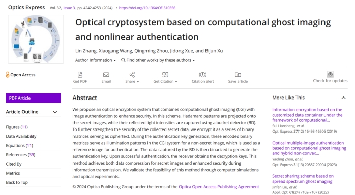 应用物理系2021级研究生张琳同学以第一作者身份在光学领域知名学术期刊《Optics Express》(影响因子3.8,中科院二区Top)上发表了题为“Optical cryptosystem based on computational ghost imaging and nonlinear authentication”的研究论文,浙江科技大学为第一单位,光子与光场调控研究团队汪小刚教授为论文通讯作者,徐弼军教授为共同指导教师。