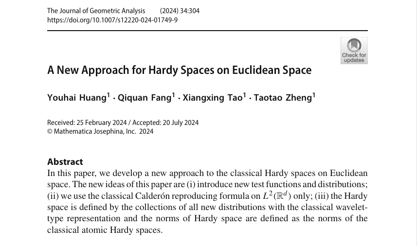 近日,实分析与调和分析及应用团队在J. Geom. Anal. 上发表了题为“A New Approach for Hardy Spaces on Euclidean Space”的研究论文。此论文浙江科技大学为唯一单位,2022级研究生黄友海为第一作者,房启全为论文通讯作者,陶祥兴、郑涛涛为共同作者。J. Geom. Anal. 是美国Mathematica Josephina出版公司和美国数学会联合出版的杂志,中科院二区TOP,影响因子1.2。