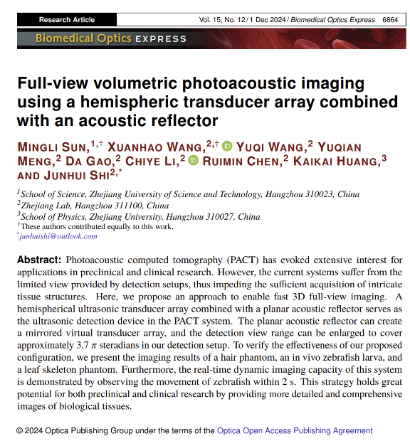 光子与光场调控研究团队在光声成像研究领域取得进展,相关研究成果以“Full-view volumetric photoacoustic imaging using a hemispheric transducer array combined with an acoustic reflector”为题,发表于光学领域期刊《Biomedical Optics Express》(影响因子2.9,中科院2区)。浙江科技大学为第一单位,av影片