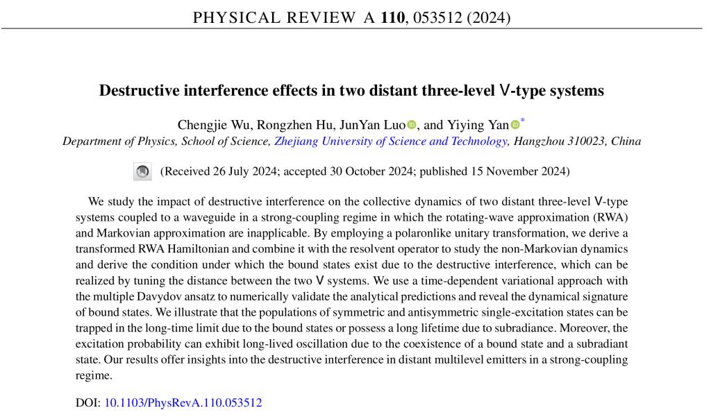 量子信息物理研究团队在量子光学领域取得重要进展,研究成果“Destructive interference effects in two distant three-level V-type systems”在物理学国际学术期刊《Physical Review A》(IF=2.6,中科院二区)上发表。该研究由浙江科技大学作为第一单位,物理学硕士研究生吴承杰担任第一作者,应用物理系骆钧炎老师和颜益营老师分别为共同指导教师和通讯作者。