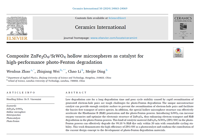 量子关联物质研究团队在“能源材料光催化降解污染物”研究中取得重要进展,研究成果以论文形式发表在国际期刊《Ceramics International》上(IF: 5.1,中科院二区),论文题目为《Composite ZnFe2O4/SrWO4 hollow microspheres as catalyst for high-performance photo-Fenton degradation》。青年博士赵文华为该论文的第一作者和通讯作者,浙江科技大学为第一单位。该研究得到了国家自然科学基金、甘肃省自然科学基金、浙江科技大学基础科研业务基金的支持。