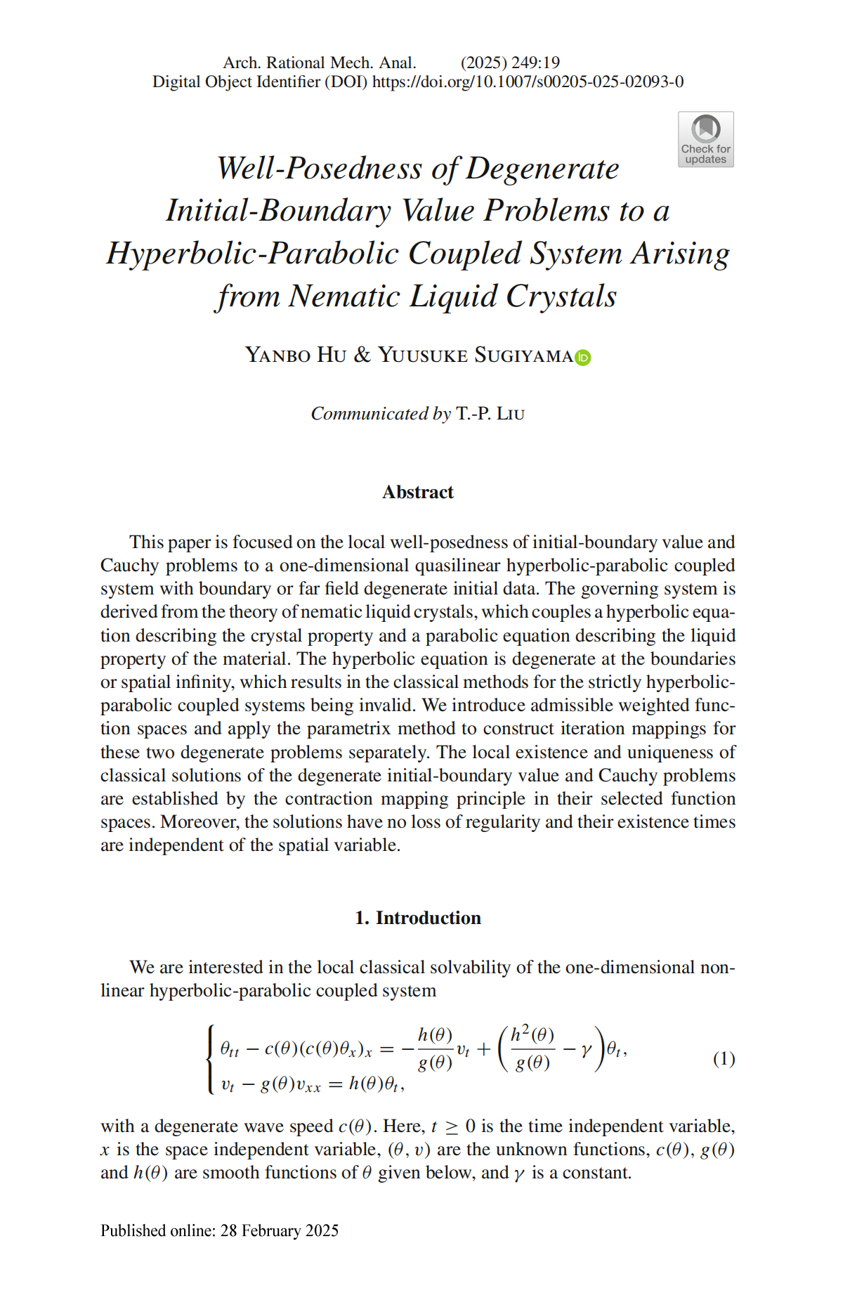 近日,非线性偏微分方程团队胡燕波教授与日本The University of Shiga Prefecture的Yuusuke Sugiyama教授合作,在Archive for Rational Mechanics and Analysis(理性力学与分析档案,简称ARMA)上发表了题为“Well-Posedness of degenerate initial-boundary value problems to a hyperbolic-parabolic coupled system arising from nematic liquid crystals”的研究论文,全文66页。该论文胡燕波教授为第一作者,浙江科技大学为第一完成单位。