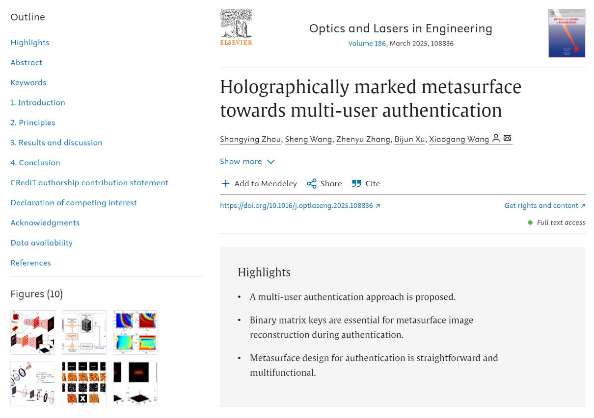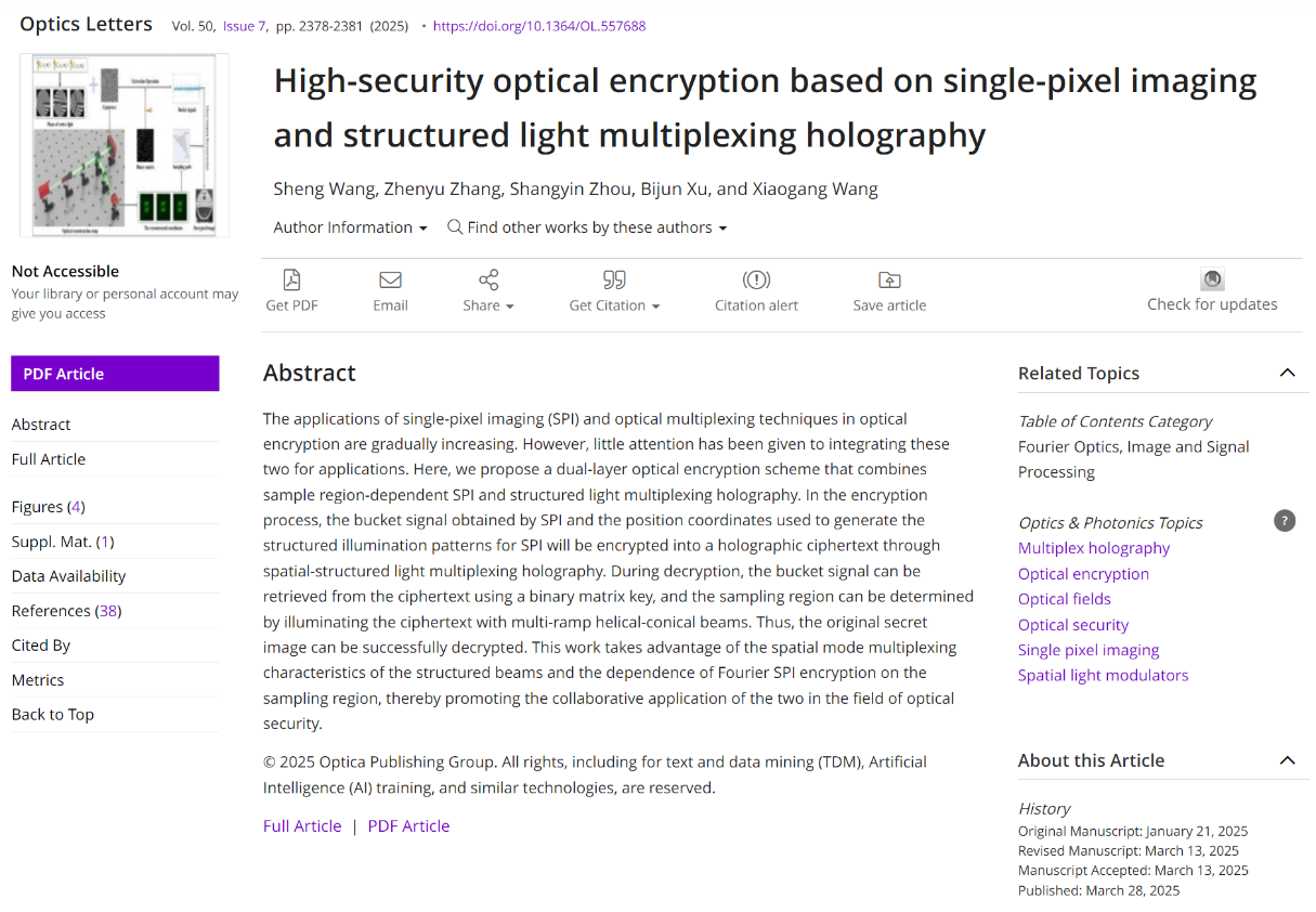 光子与光场调控研究团队汪小刚教授的指导下,应用物理系2022级研究生汪晟同学以第一作者的身份,在光学领域著名学术期刊《Optics Letters》(影响因子3.1,JCR一区、中科院二区)发表了题为“High - security optical encryption based on single-pixel imaging and structured light multiplexing holography”的研究论文。同期,应用物理系2022级研究生周尚营同学也以第一作者身份,在工程技术领域知名学术期刊《Optics and Lasers in Engineering》(影响因子3.5,JCR一区、中科院二区)发表了题为“Holographically marked metasurface towards multi - user authentication”的研究论文。以上两篇论文的第一署名单位均为浙江科技大学,汪小刚和徐弼军分别为论文通讯作者和共同指导教师。