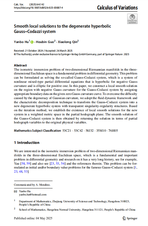 近日,非线性偏微分方程团队胡燕波教授与合作者在数学领域国际著名期刊《Calculus of Variations and Partial Differential Equations》上发表了题为“Smooth local solutions to the degenerate hyperbolic Gauss-Codazzi system”的研究论文,全文49页。该论文胡燕波教授为第一兼通讯作者,浙江科技大学为第一兼通讯单位。