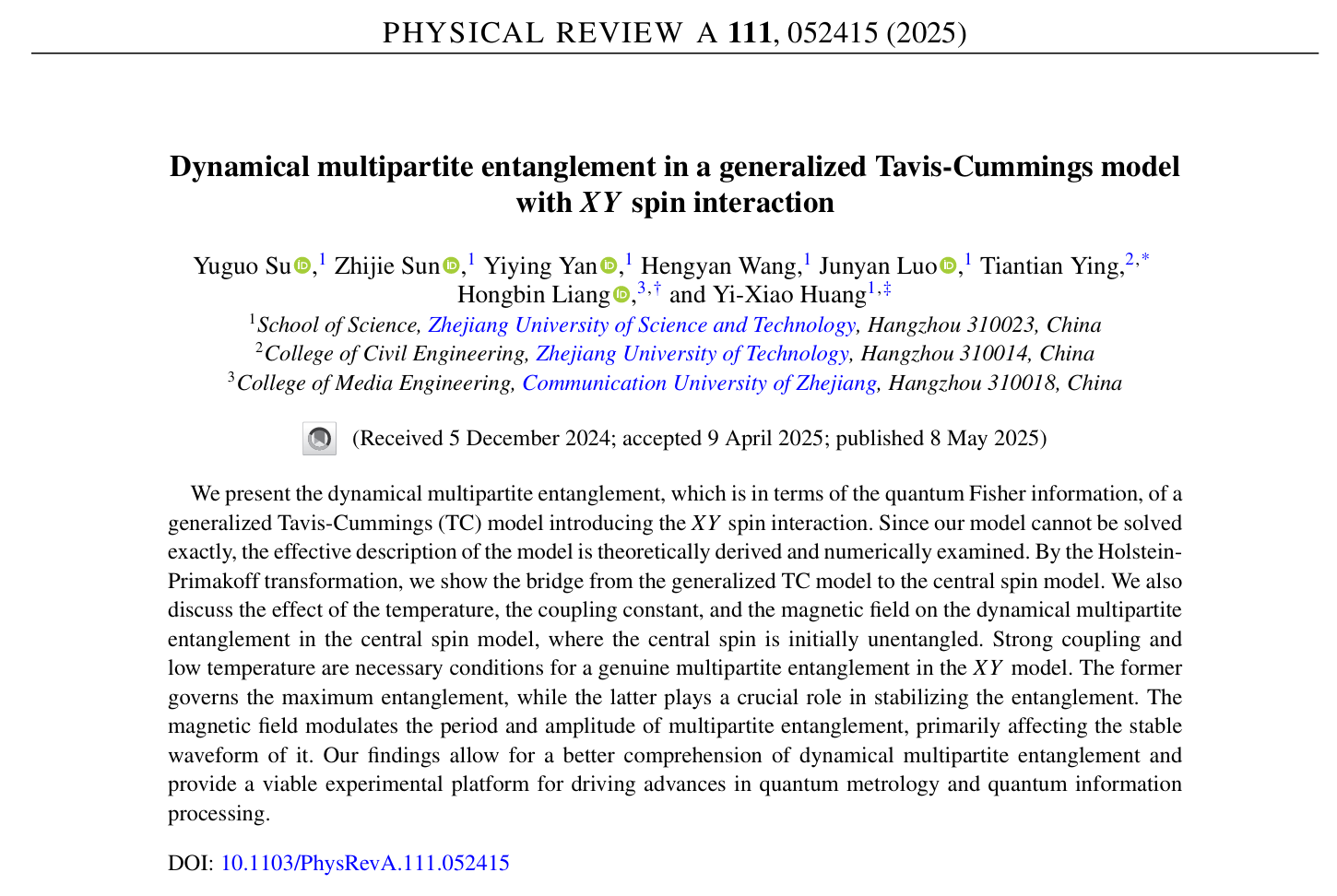 应用物理系量子信息物理研究团队在国际学术期刊《Physical Review A》(IF= 2.6,中科院二区)期刊上发表了题为" Dynamical multipartite entanglement in a generalized Tavis-Cummings model with XY spin interaction"的研究论文。浙江科技大学为第一单位,应用物理系苏玉国博士为第一作者,2023级物理学硕士研究生孙志杰为第二作者,应用物理系黄奕筱副教授为共同通讯作者。此研究获得国家自然科学基金、浙江科技大学基本科研业务费专项资金的支持。