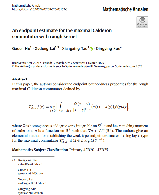 近日,实分析与调和分析及应用团队胡国恩教授、陶祥兴教授与合作者在数学领域著名的德国数学年刊《Mathematische Annalen》上发表了题为“An endpoint estimate for the maximal Calderón commutator with rough kernel”的研究论文,全文35页。此论文胡国恩教授为第一作者,陶祥兴教授为通讯作者,浙江科技大学为第一兼通讯单位。