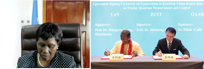 开幕式最后阶段,浙江科技大学校长陈建孟教授和非洲全球学术博士组织负责人欧迪博士(线下)与肯尼亚内罗毕大学校长玛格丽特·哈钦森教授(线上)共同签署了《中肯精密量子测量与调控联合实验室协议》。(应用物理系:苏玉国  学科办:陈璟)