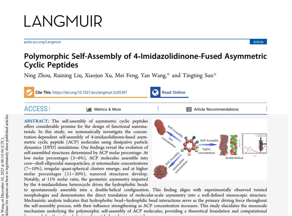 软物质与功能纳米材料研究团队在“不对称环肽分子自组装领域”取得重要的研究进展,相关研究成果以浙江科技大学为第一单位在国际期刊LANGMUIR(IF = 3.9,中科院SCI二区,JCR Q1)上,在线发表题目为“Polymorphic Self-Assembly of 4-Imidazolidinone-Fused Asymmetric Cyclic Peptides”的论文。物理学硕士研究生周宁为该论文第一作者,应用物理系王艳博士和孙婷婷教授为通讯作者。该研究得到了国家自然科学基金的支持。