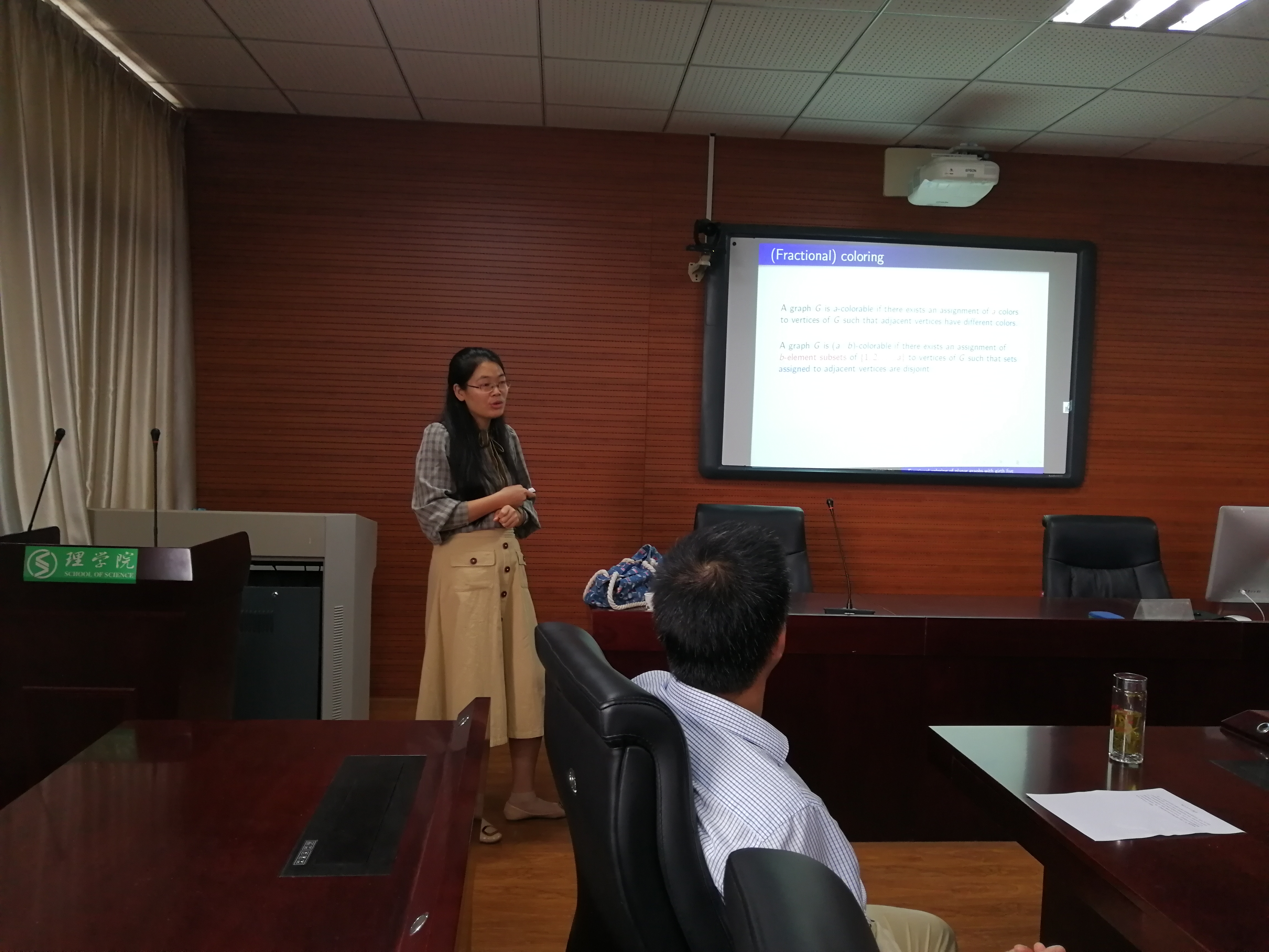 胡小兰博士首先介绍了分数染色的研究背景及一些相关概念,然后介绍了历年来关于分数染色的一些重要结论、性质和猜想,接着结合平面图的一些性质和数学归纳法证明了围长至少为5的平面图的分数染色数至多为3-3/(2M∆+1), 其中M∆为常数。最后提出了一些可待进一步研究的问题。会后,胡小兰博士与在场的师生又做了进一步的交流。