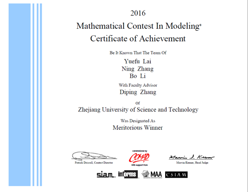 的王树一(14信计)、毛珂瑞(14信计)、毛冬媛(14应用物理)同学组成的代表队(指导教师:李蔚)获得国际三等奖(Successful Participant)。