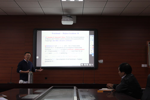 报告中,杨大春教授为大家系统的讲解了度量测度空间上的索伯列夫空间最近几年的专题性研究工作及其成果。